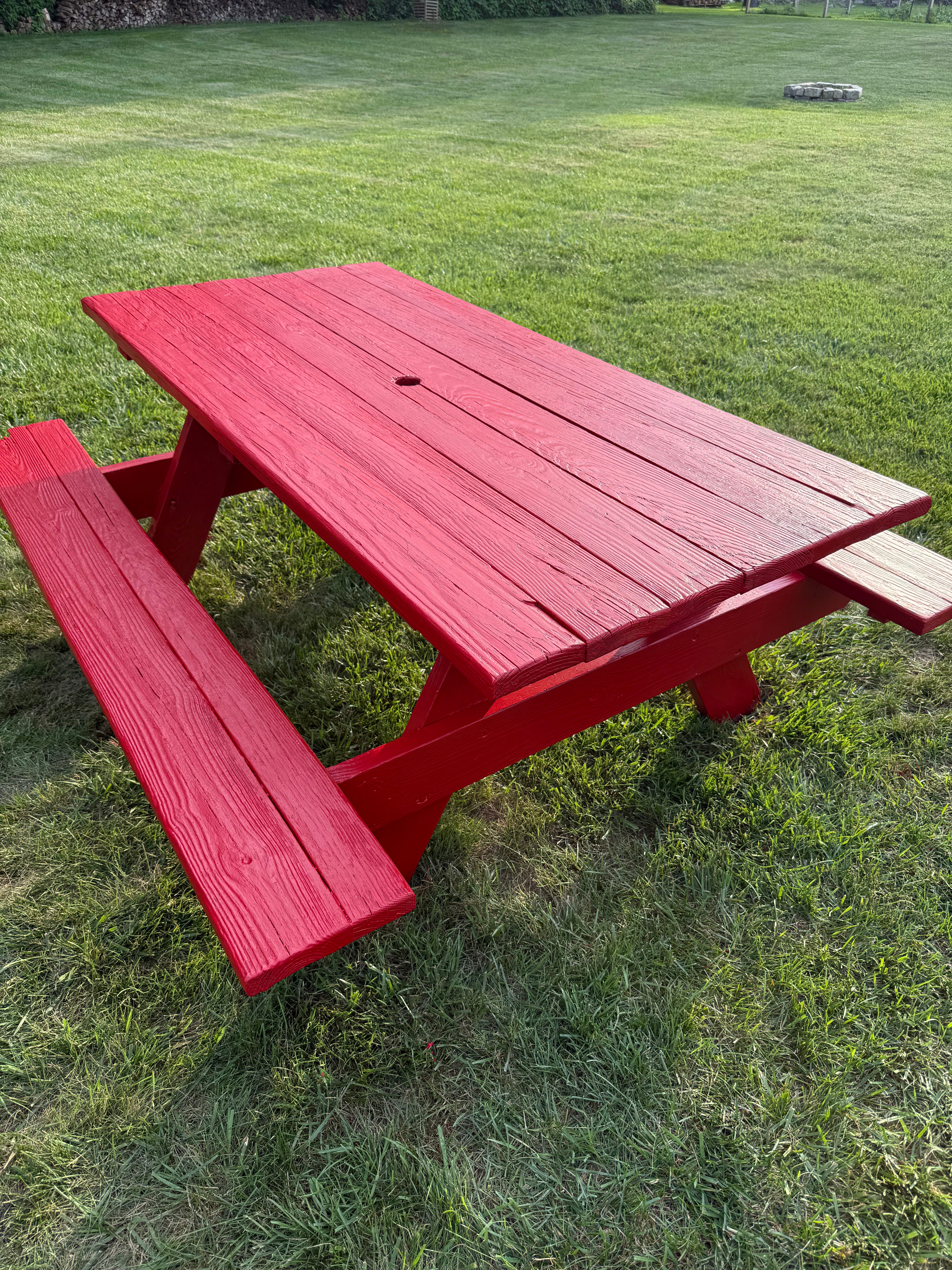 Removed the (massive) hedges along the side of my house, and painted my picnic table red. And I mean REALLY red.